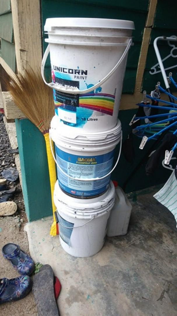 Senang nak mop dan sapu. Tong saiz kecil sering dilengkapi dengan pemegang sampingan yang dapat menahan berat wadah dengan air. Sales assistant suggest guna cat jenama Dulux Maxilite Plus.