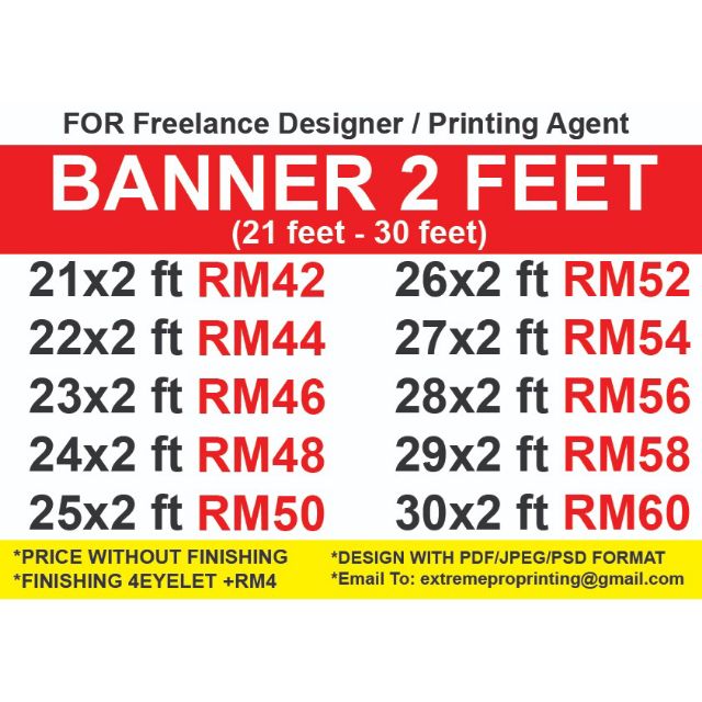 RM 35 ke atas untuk setiap satu design. Tiada Minimum Saiz Dikenakan. HARGA KAMI TERLAJAK MURAH --- TANPA KOS DESIGN Kami menggunakan Perisian Adobe Photoshop dan Illustrator bagi menghasilkan seuatu design banner 4x2 - RM 25 bunting 2x4 - RM25 banner 4x3 - RM35 bunting 2 x 5 - RM35 lain-lain saiz boleh wasap direct ke wasapmy601133358510 wasapmy601133358510 PANDUAN SAIZ CARA ODER.