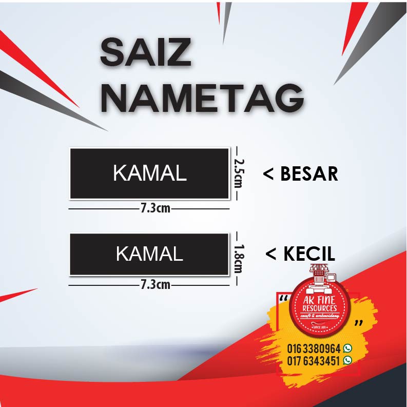 Ukuran saiz name tag ialah 12 cm x 9 cm sila klik dibawah guru pengiring peserta. Terdapat beberapa jenis tanda nama yang dipakai oleh guru-guru atau penjawat awam lain namun sebenarnya hanya 1 sahaja yang menepati pekeliling yang telah ditetapkan oleh kerajaan. Saiz berukuran 75cm x 25cm.